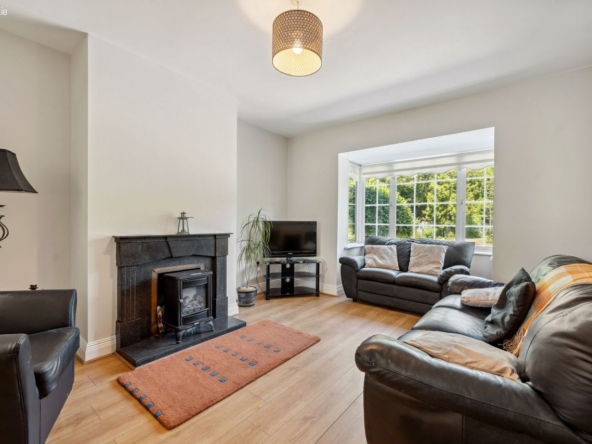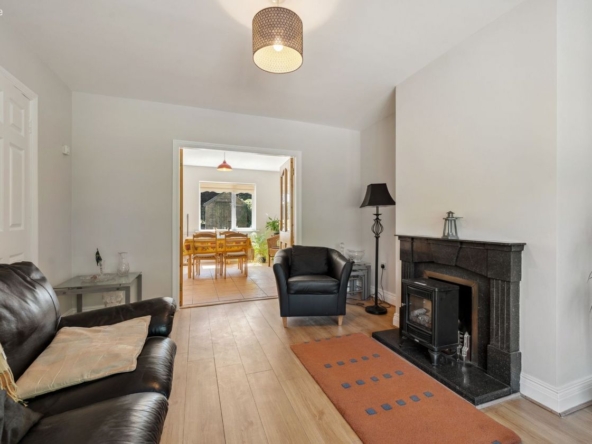 Sitting Room: Bright room with feature bay window. Laminate flooring and fitted multi-fuel stove. French doors to: