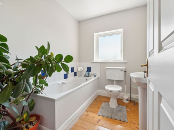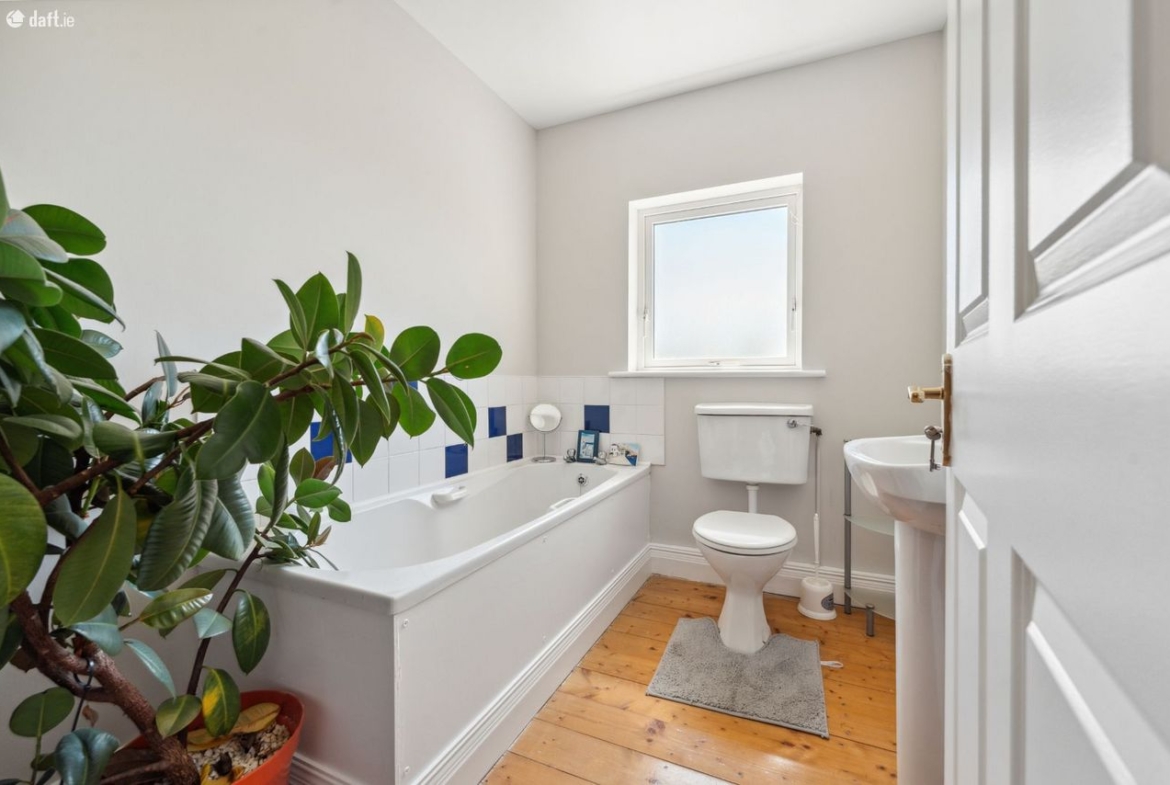 Bathroom: WC, wash hand basin, bath and varnished pine flooring.