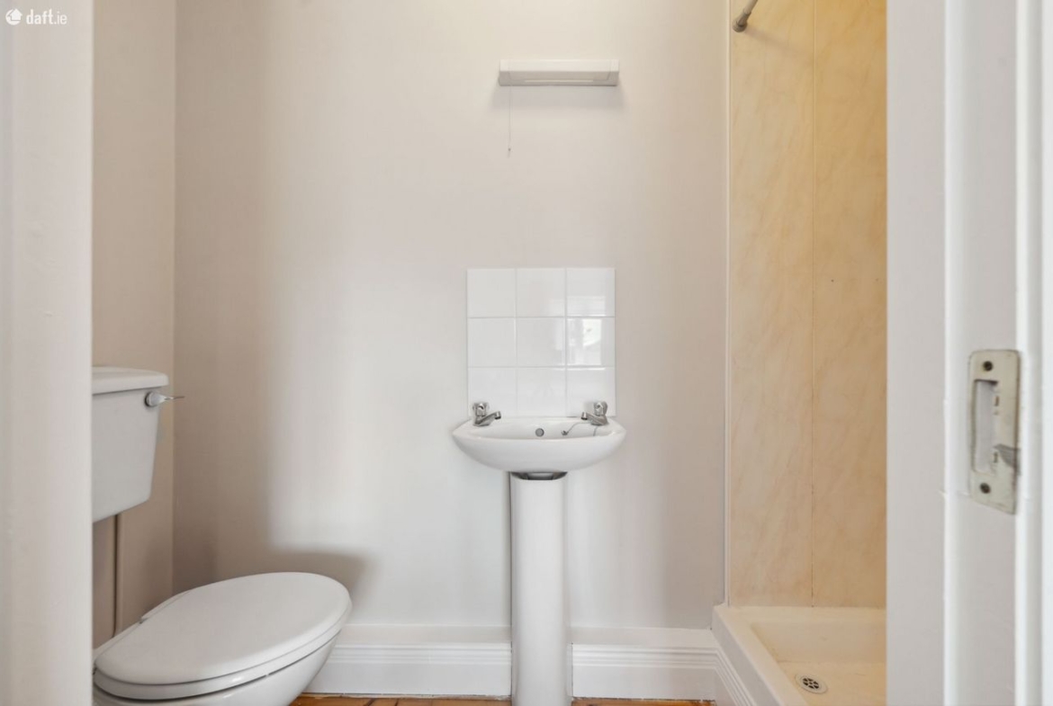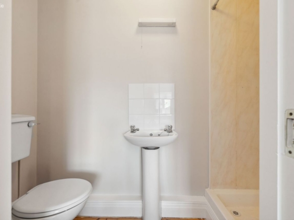 En-suite: W. C., wash hand basin and electric shower. Tiled flooring and shower area.