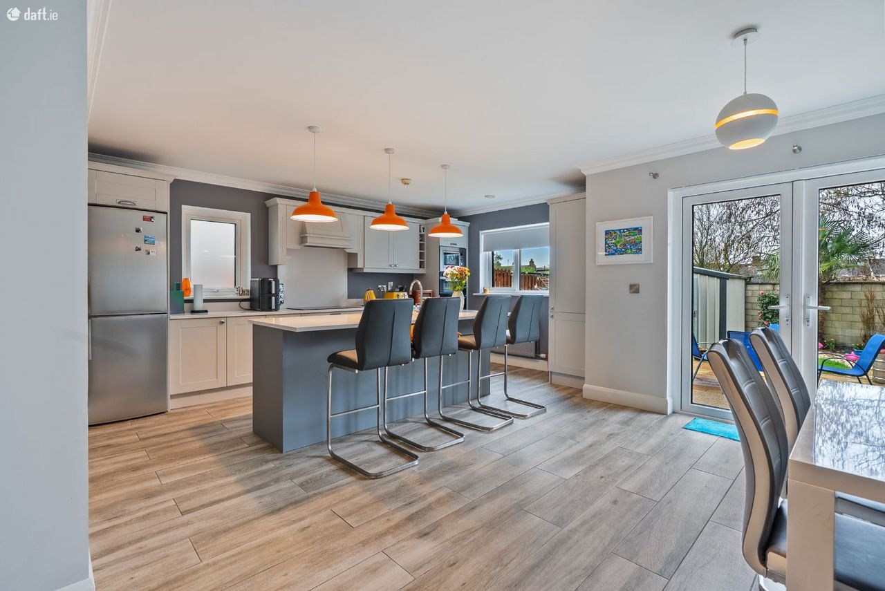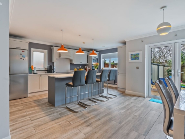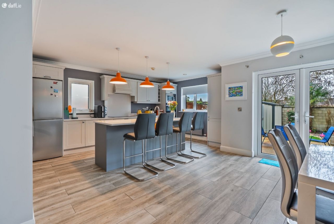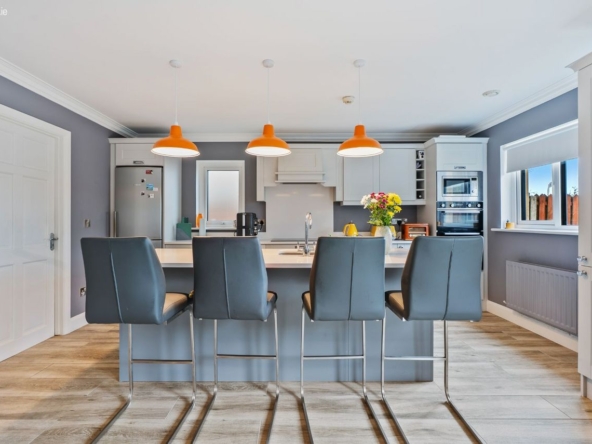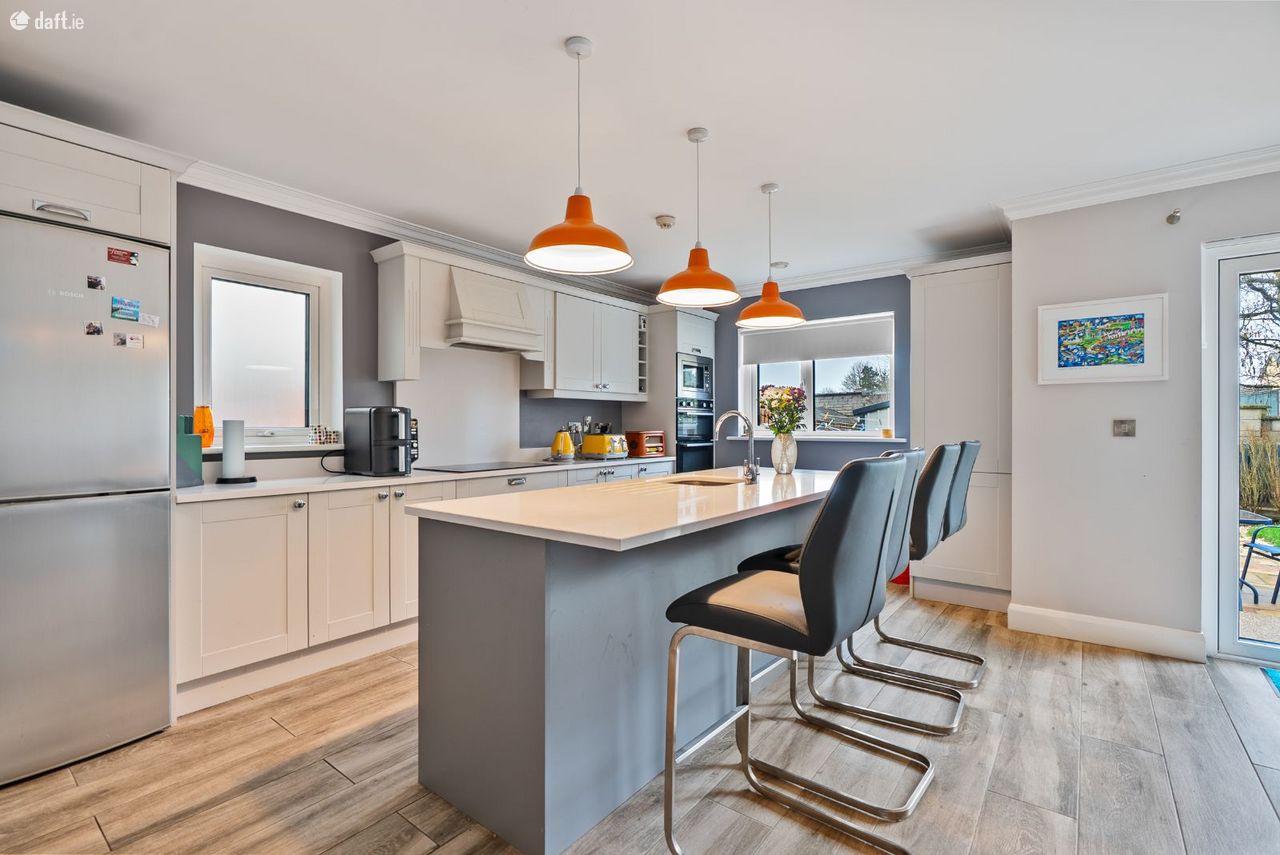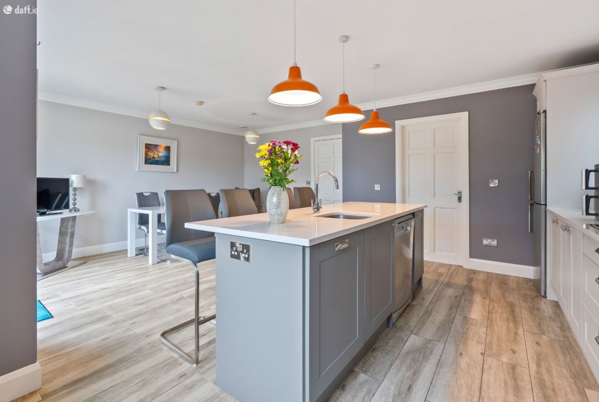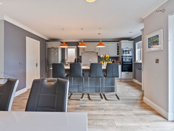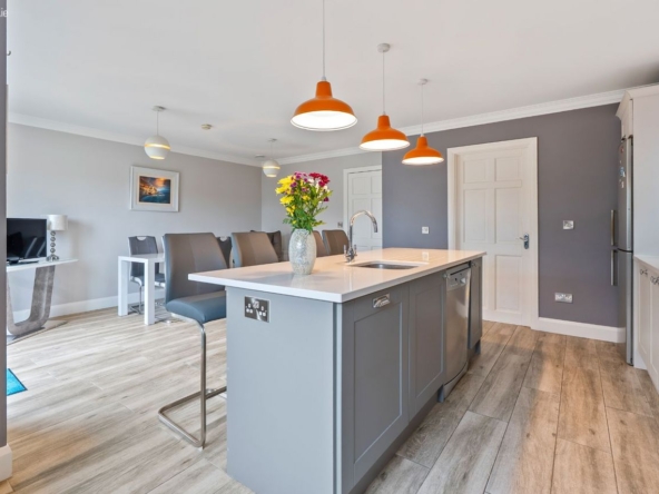 Kitchen/Dining: Fully fitted kitchen with integrated induction hob, electric double oven & microwave. Kitchen island with sink, dishwasher & storage.