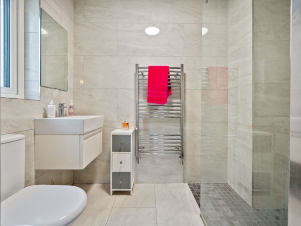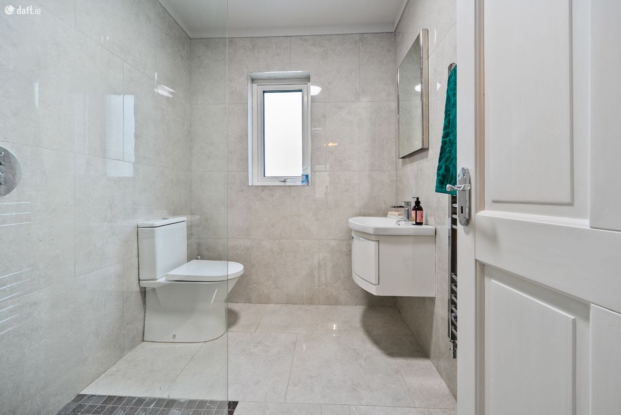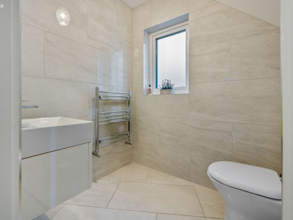 Family bathroom: W.C., wash hand basin & walk-in shower, fully tiled.