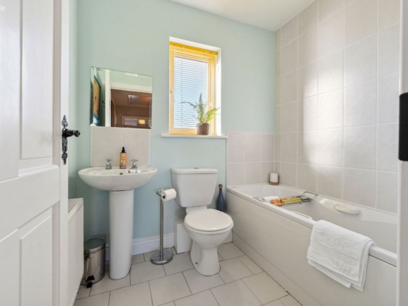 Family Bathroom: W.C., wash hand basin & bath with shower attachment. Floor, bath & sink area tiled.