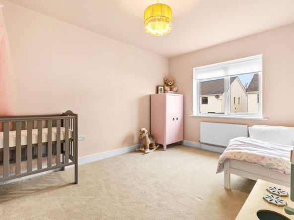 Upstairs, three well-scaled bedrooms are arranged around a central landing, with the main bedroom enjoying a fully tiled en-suite, complemented by a sleek family bathroom and generous storage throughout. Additional benefits include attic conversion potential (subject to planning), air-to-water heating, fibre broadband, and EV-ready infrastructure.