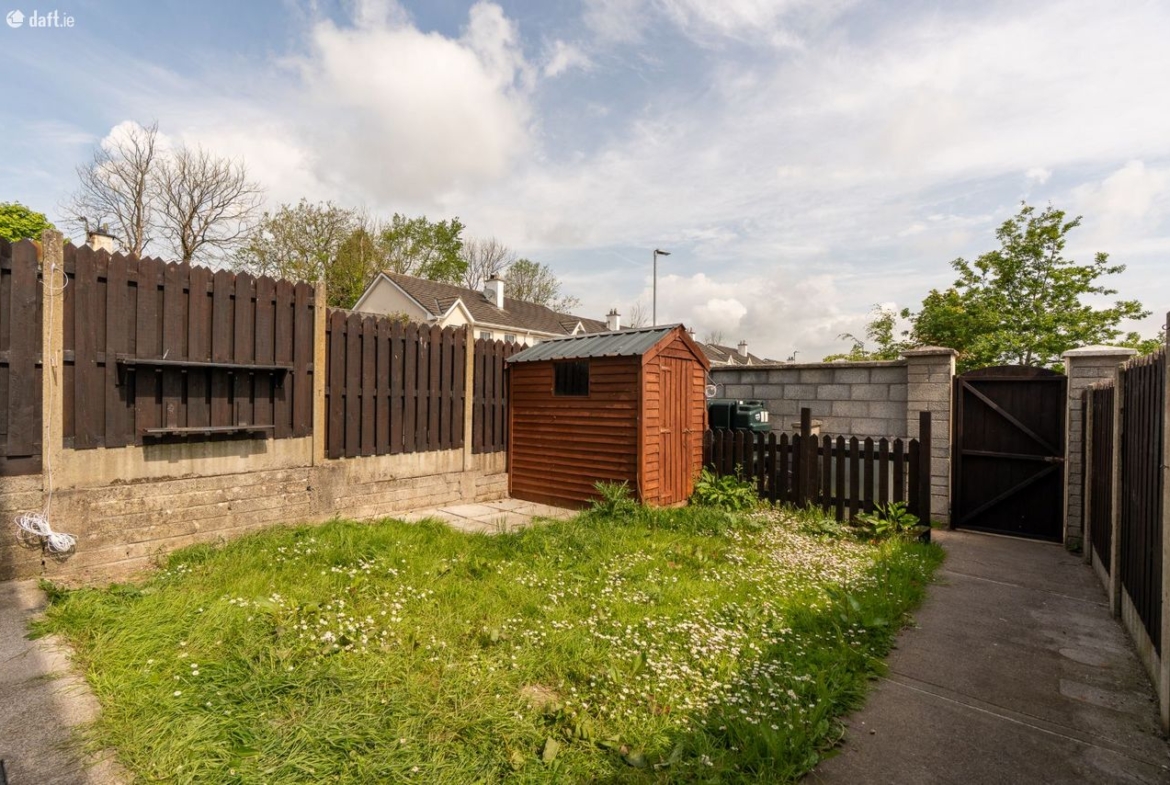 grass area, garden shed, gated pedestrian access leading to development with large green