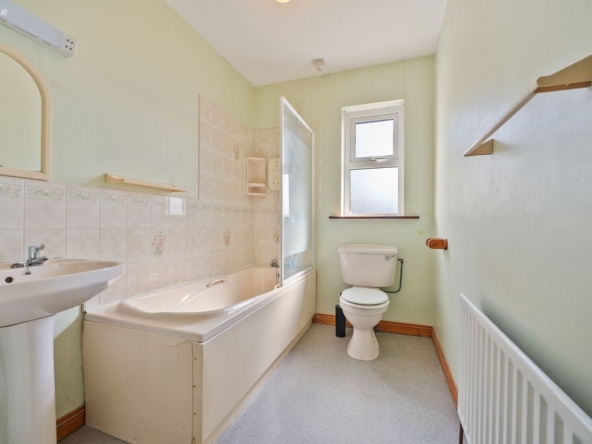 Bathroom: W.C., wash hand basin, bath with shower attachment. Tiled bath area and splashback. Tiled flooring.