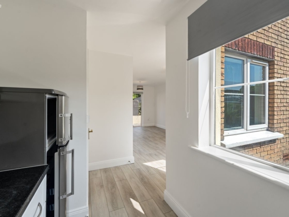 Youll find over 620 sq. ft. of bright, well-proportioned living space, starting with a warm, wooden-floored entrance hallway that leads into an open-plan kitchen, dining and living area. The layout here makes the most of natural light, with large sliding doors opening to a gravelled patio that enjoys the morning sun, a perfect spot for your first coffee of the day.