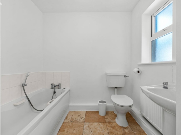 Bathroom: W.C., wash hand basin & bath with shower attachment. Floor, sink & bath area tiled.