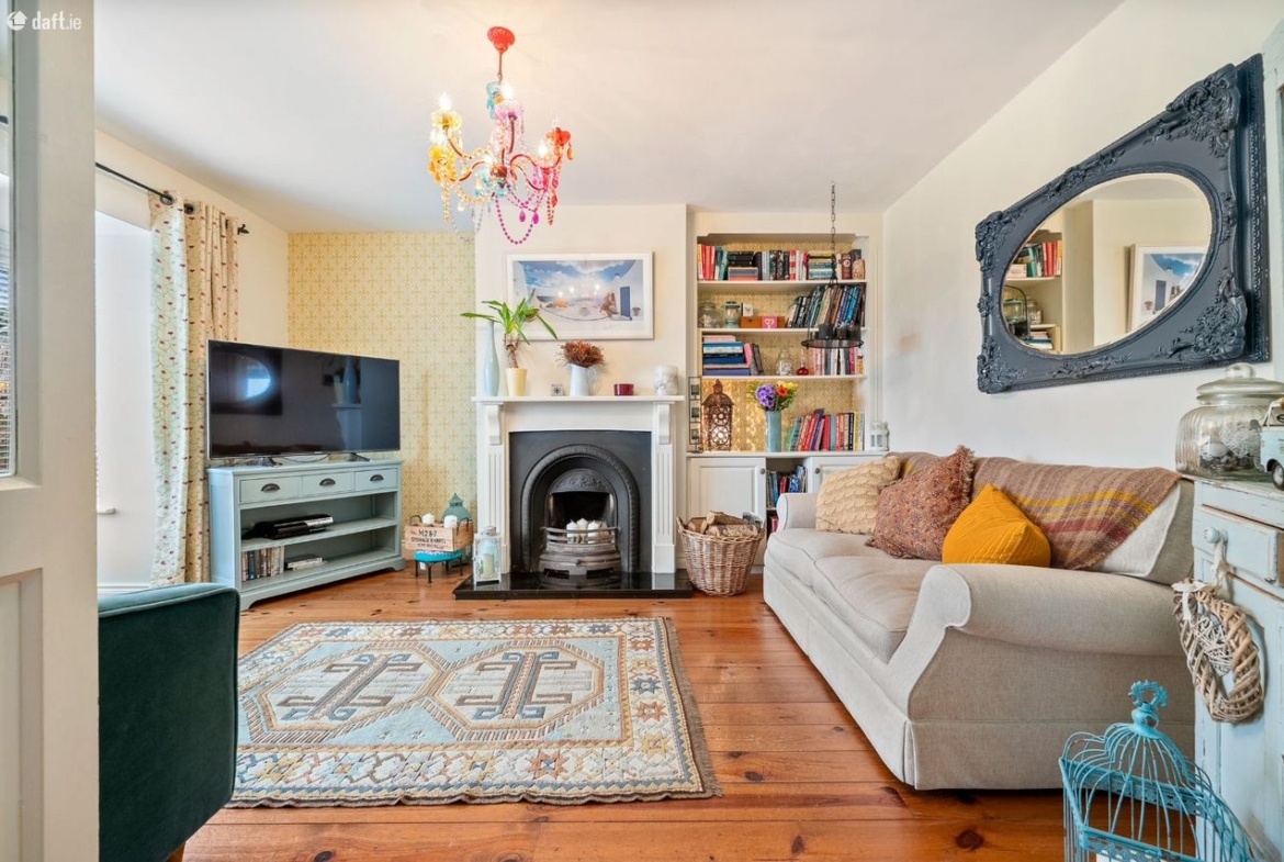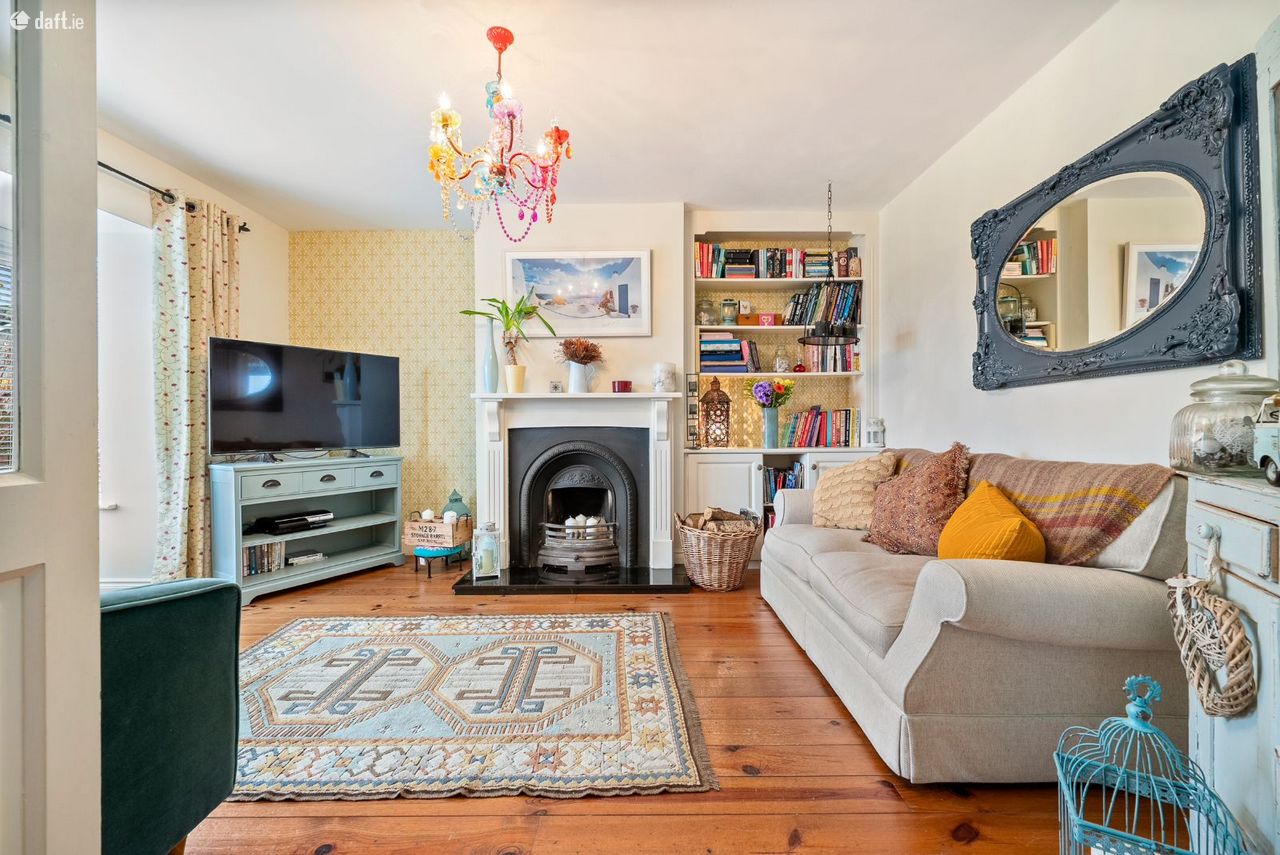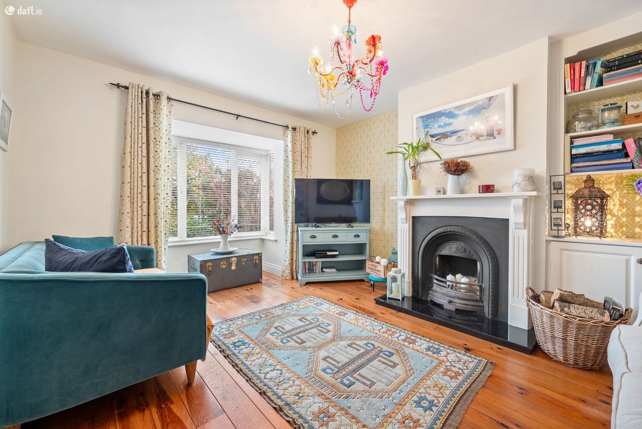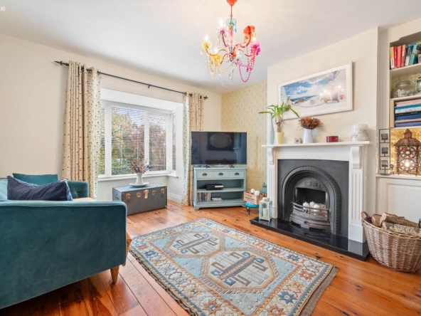 Sitting Room: Front-facing reception room featuring bay window, solid wood flooring and open fireplace.