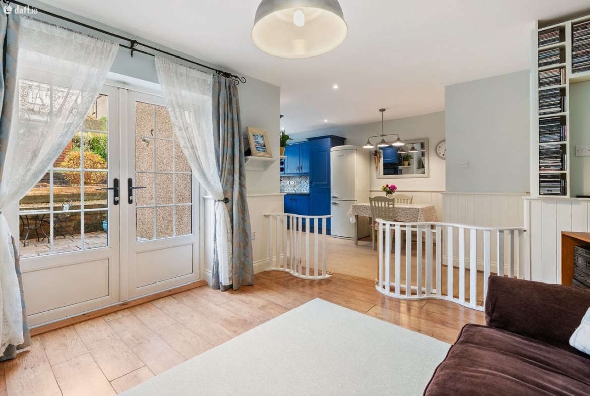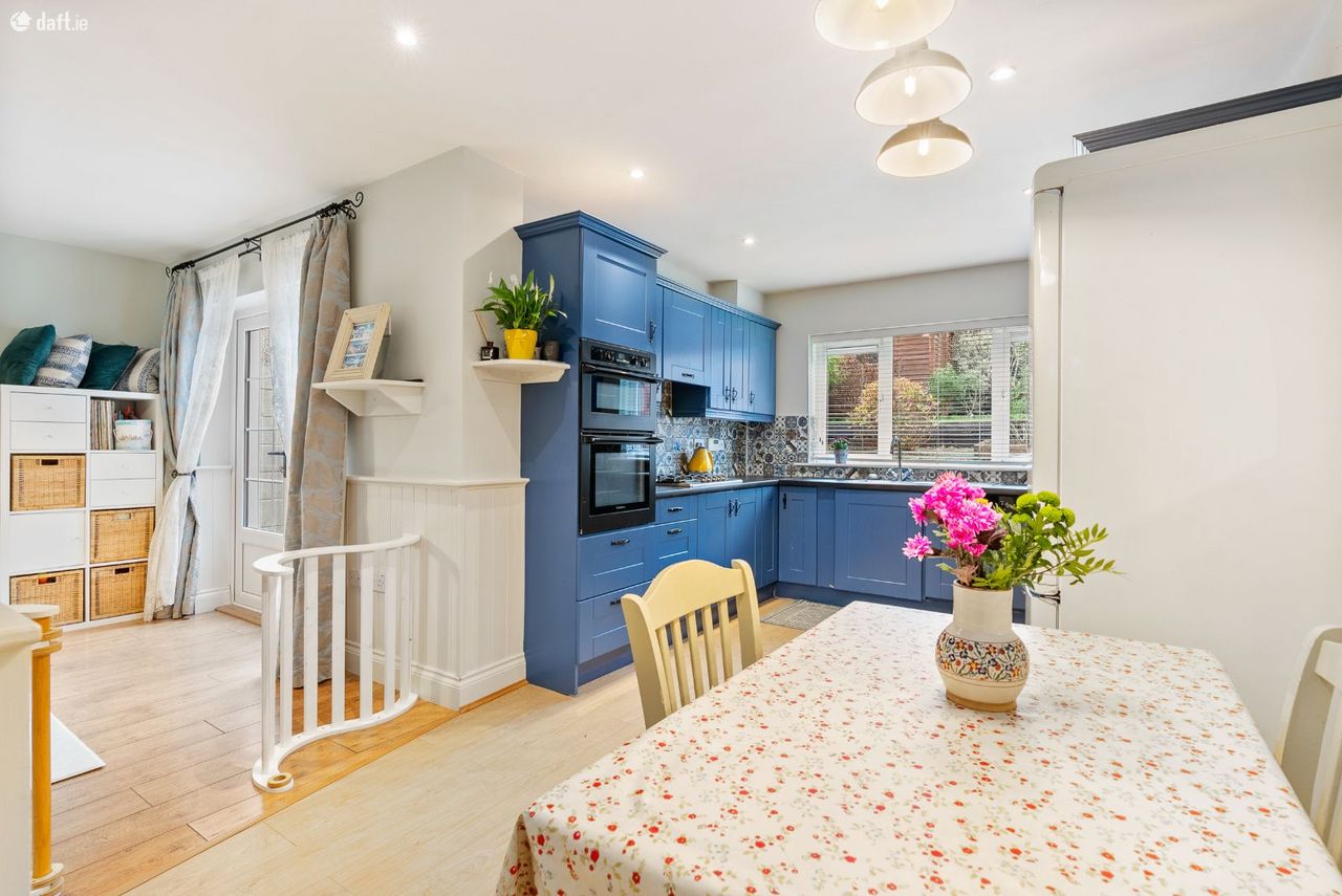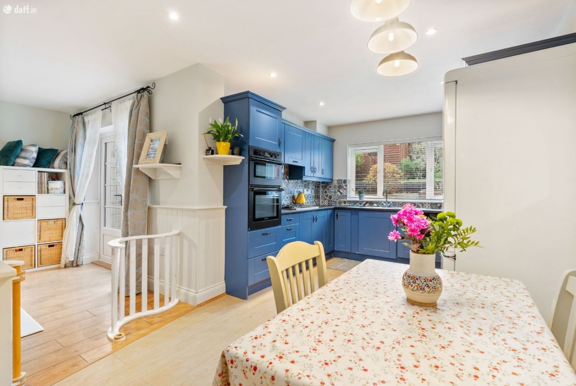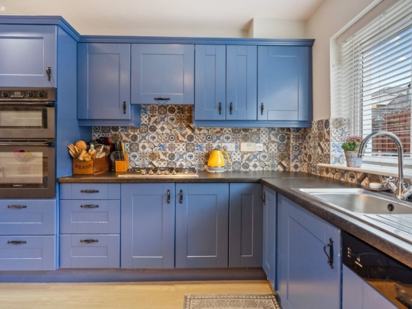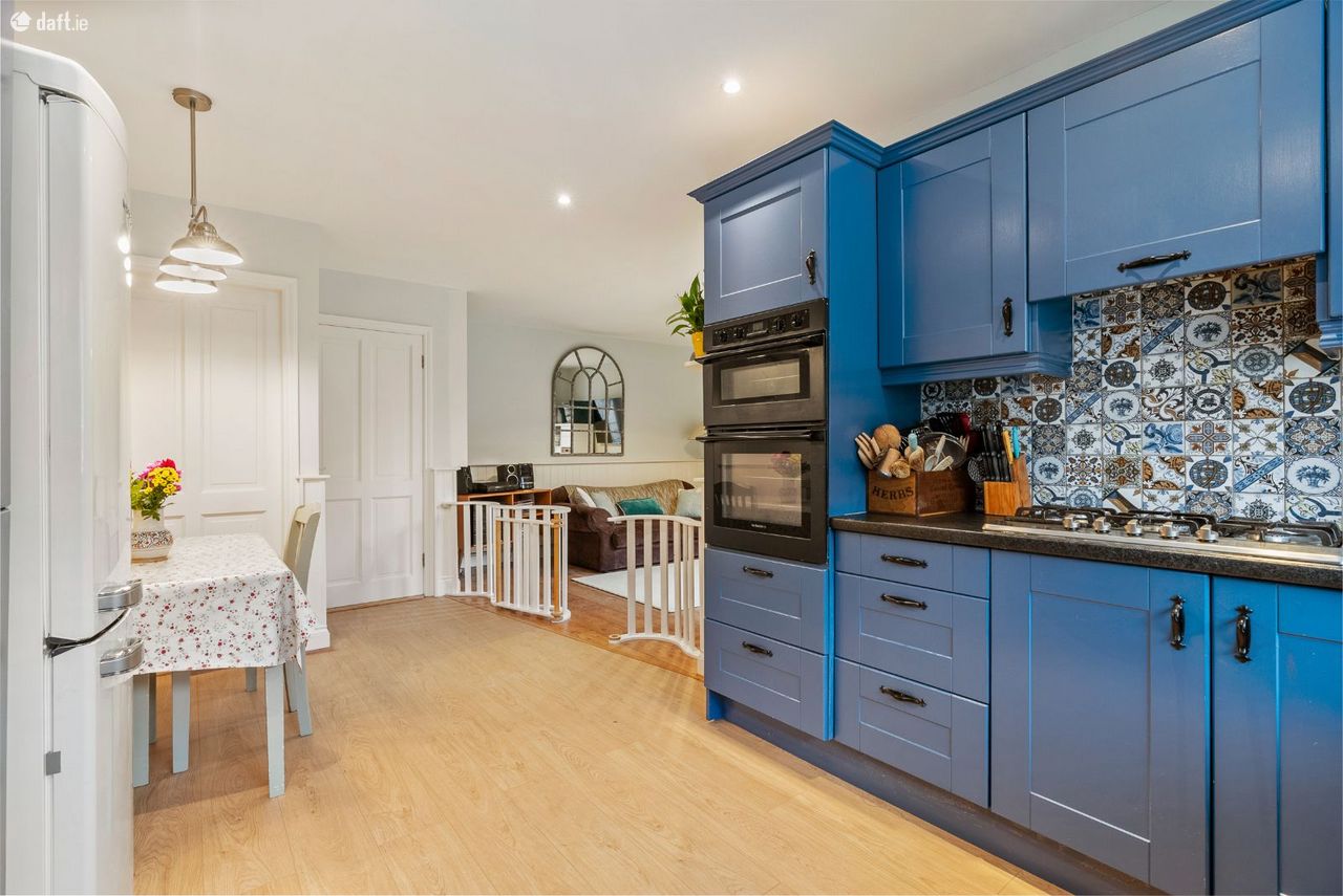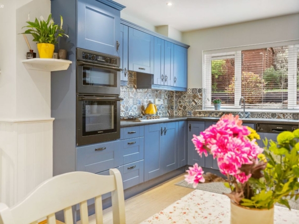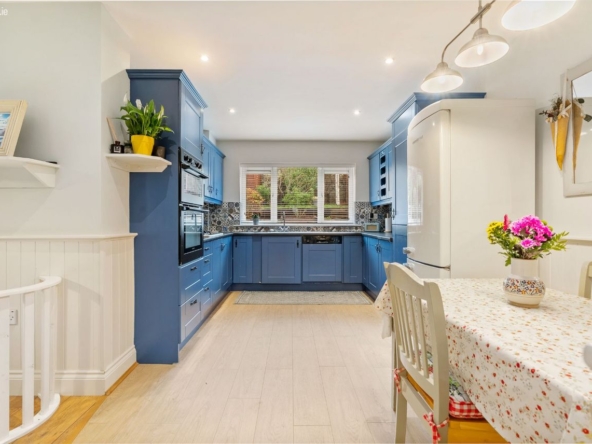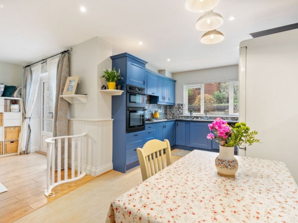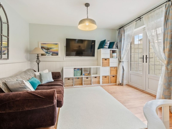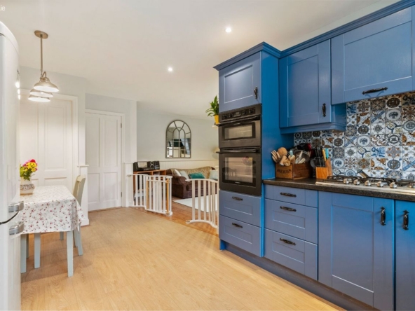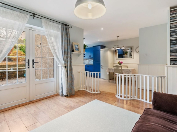 Living/Kitchen/Dining: Modern fitted units with tiled splashback, gas hob, electric oven, dishwasher, and French doors leading directly to the rear patio and garden. Open-plan layout creates a relaxed, functional family zone.