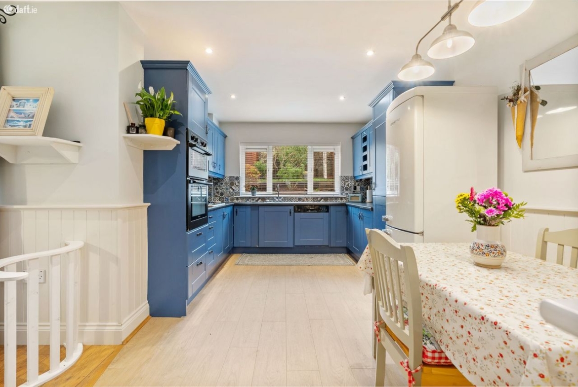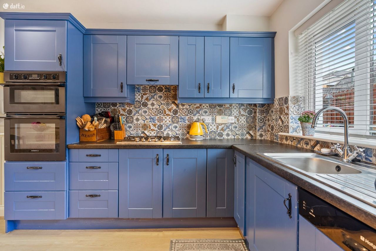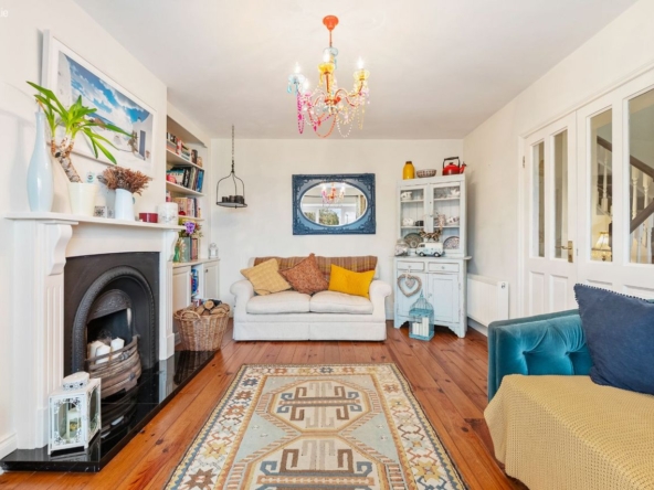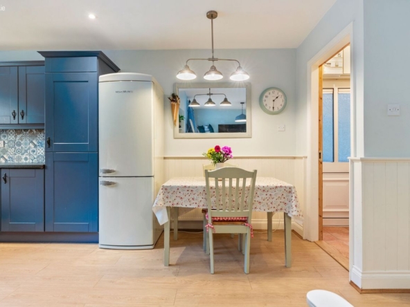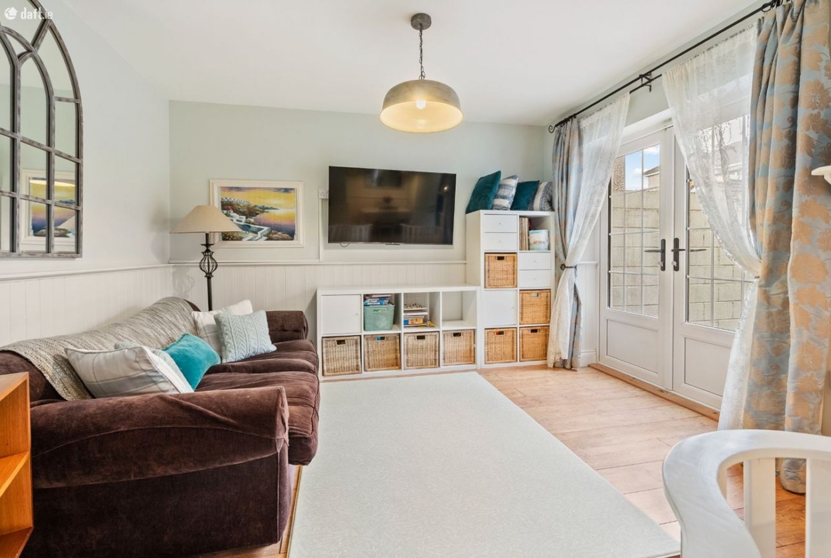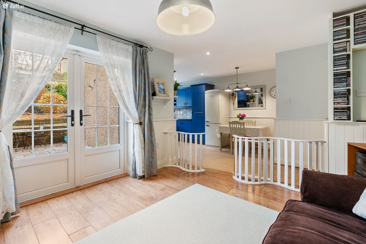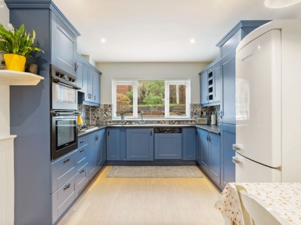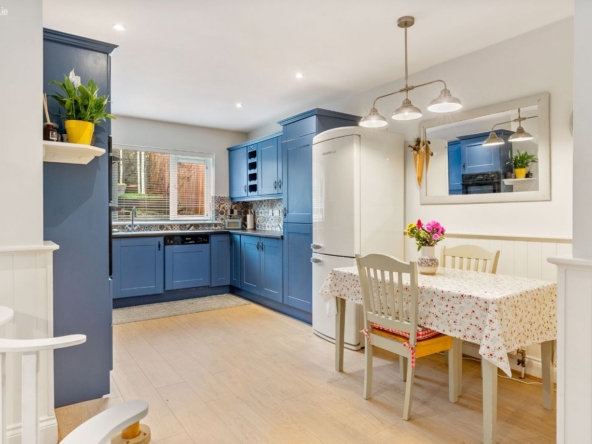 Living/Kitchen/Dining: Modern fitted units with tiled splashback, gas hob, electric oven, dishwasher, and French doors leading directly to the rear patio and garden. Open-plan layout creates a relaxed, functional family zone.