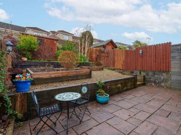 -Tiered rear garden with patio, raised beds, lawn area and garden shed.