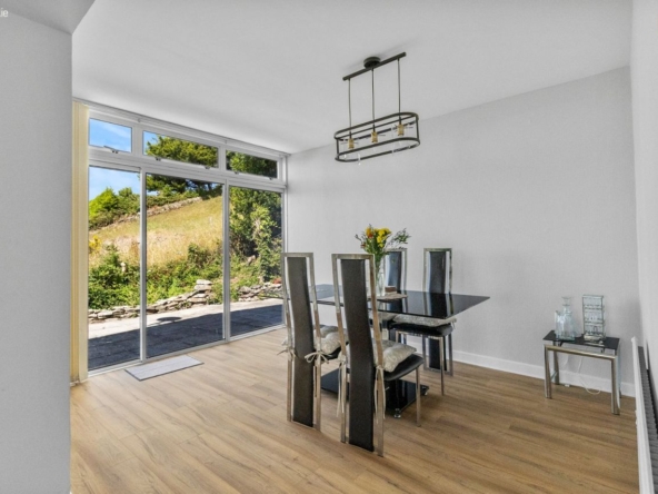 Aeries layout is defined by light, space, and outlook. The main living areas flow easily from room to room, with broad aluminium-framed windows and multiple access points to balconies and terraces. The large open-plan living and dining area offers floor-to-ceiling views across the water, with sliding glass doors, a feature chimney, and an immediate sense of tranquillity. The dining area connects to a patio via custom aluminium doors, and a separate door leads to the basement level, offering flexible future use. The kitchen features bespoke aluminium windows, an electric hob, double oven, integrated appliances and ample cabinetry. There are five bedrooms, each with flexible potential, with the master enjoying