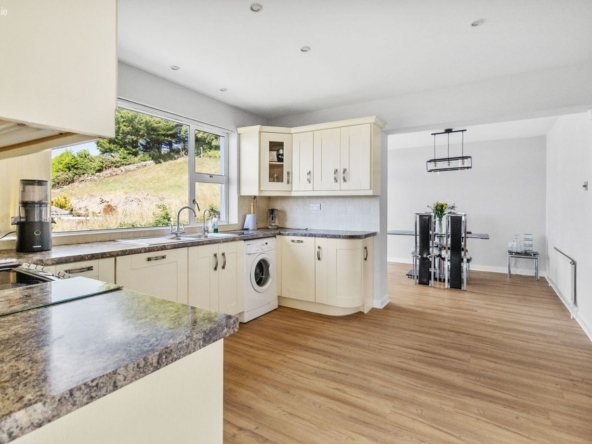 The internal layout offers fluid, open-plan living ideal for both quiet retreat and entertaining. A spacious living and dining area with a feature chimney opens directly onto the balcony, making the most of the sweeping estuary views. The kitchen, fitted with bespoke aluminium windows offers practical workspace with character. Five bedrooms (including one well-suited as a study or home office), two bathrooms, and a guest WC provide comfortable accommodation.