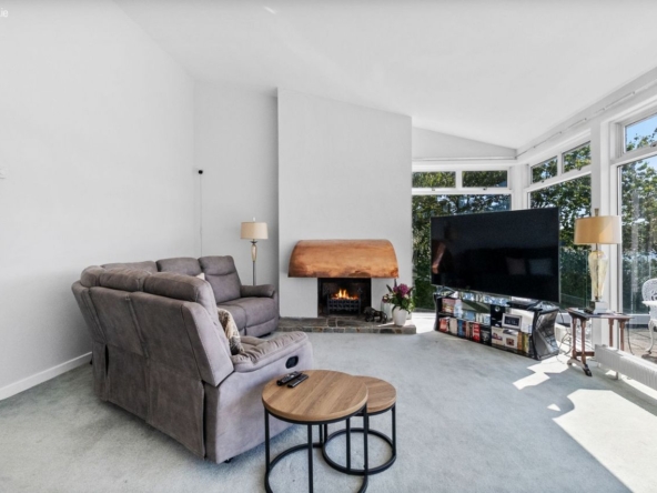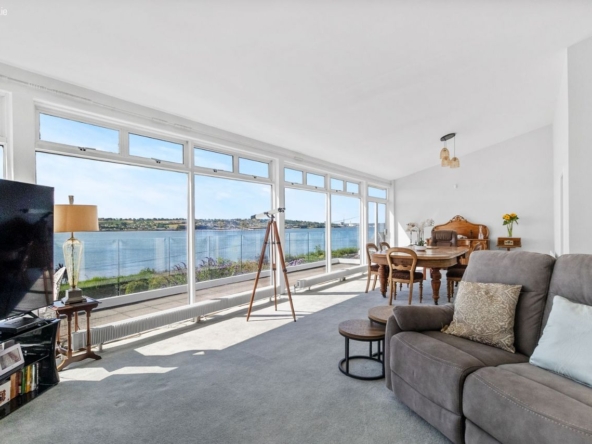 Large open-plan living/dining room with chimney and water views