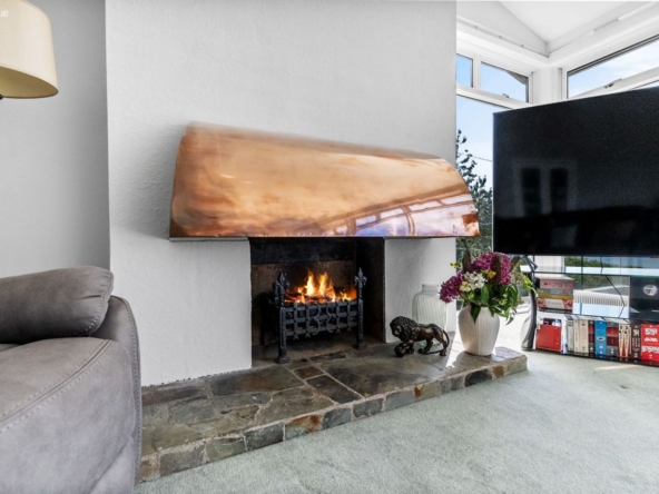 The gardens at Aerie are a standout feature, landscaped and elevated, with winding pathways, seasonal blooms, and mature apple trees providing structure and privacy. The rear garden, in particular, offers elevated views across the surrounding countryside and water. A boiler house to the side includes a dedicated storage area.