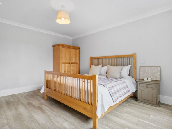Bedroom 4: Double room with timber flooring, free standing wardrobe with shelving unit.
