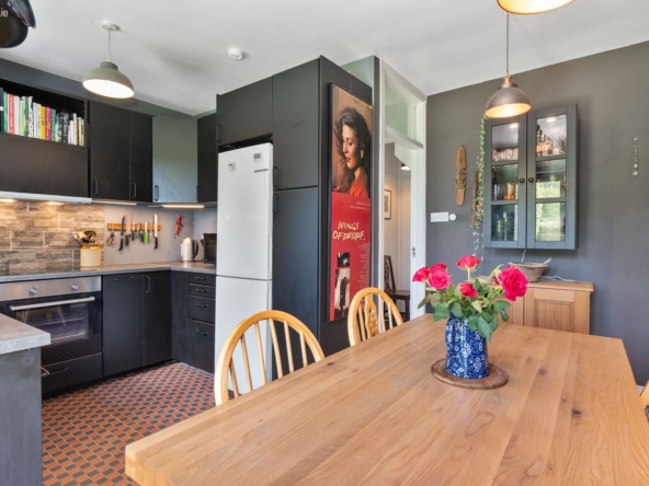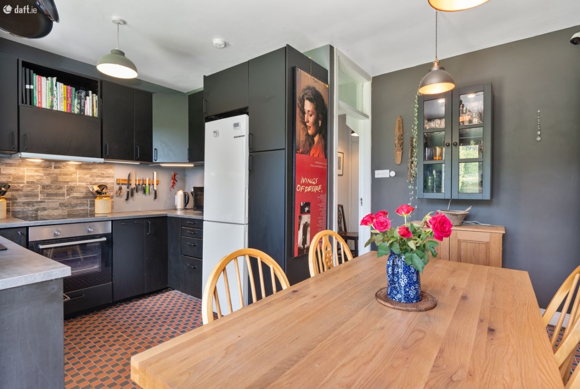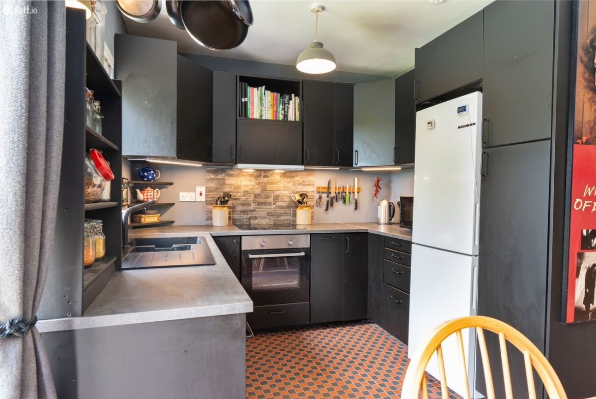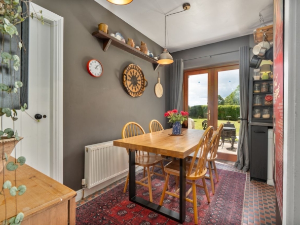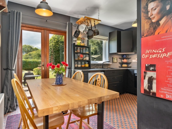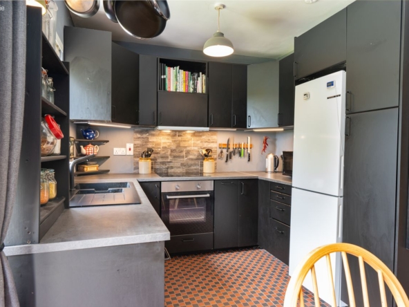 Kitchen/Dining Area: Fully fitted black kitchen with integrated electric hob & oven, ‘Victorian’ tiled flooring, and tiled splashback. French doors leading to rear patio and garden.