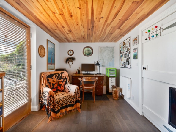 Bedroom 3: Triple aspect room with feature port window. Engineered wood flooring, door to side and ‘Fahro’ programmable electric radiator. Currently being used as an office.