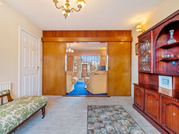 Living Room: Front-facing reception room with carpet flooring and sliding doors; suitable as a formal living room or additional reception space.