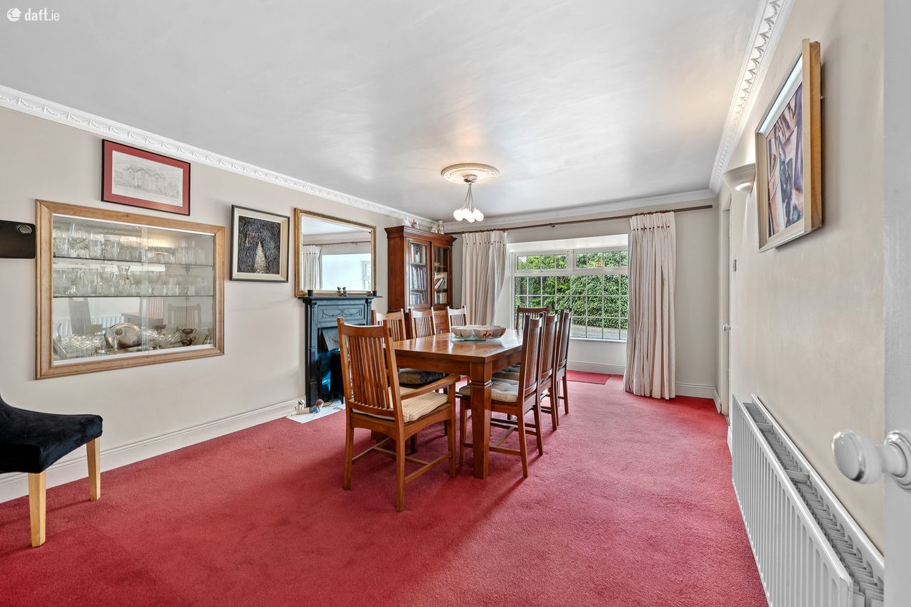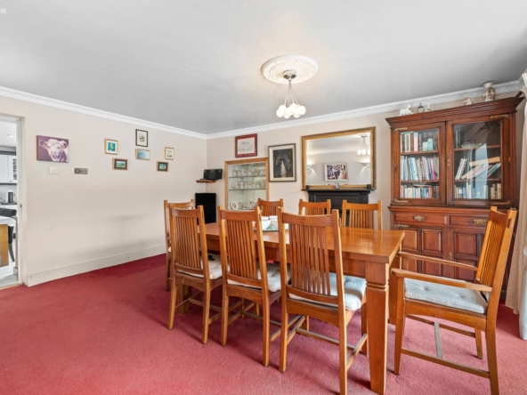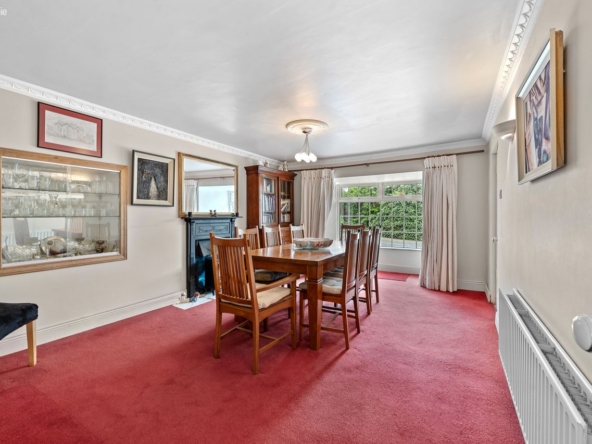 Dining Room: Front aspect room with bay window, electric stove fitted with cast iron surround, carpeted flooring, ceiling coving and centre rose. Door to: