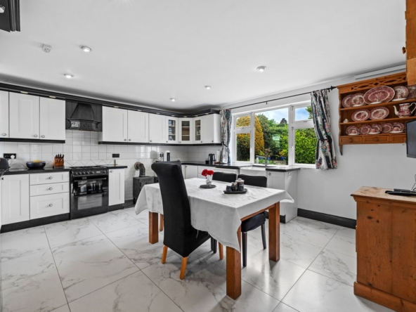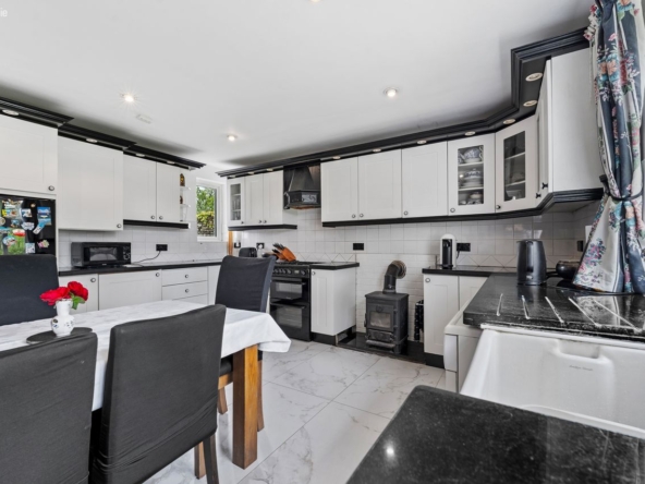 Kitchen/Dining: Fully fitted white kitchen with granite work-top, with Belfast sink, free standing gas cooker with gas hob, fridge/freezer and dishwasher. Wood burning stove fitted. Recessed lighting and spot lighting. Feature grey and white floor tiling and white tiled splashback. Door to:
