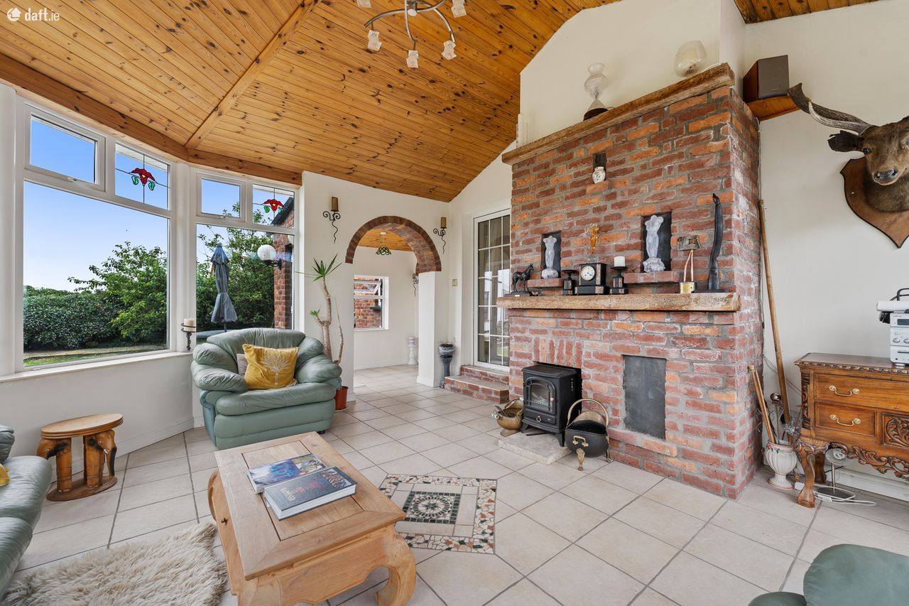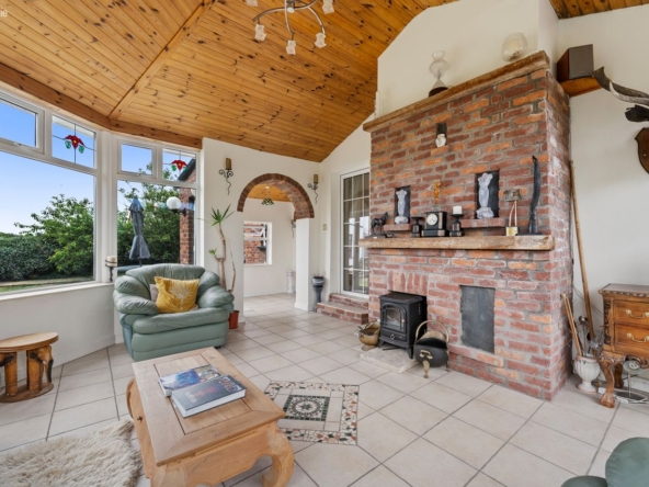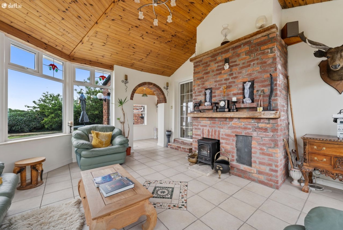 Sunroom: Bright room with tiled flooring, feature brick wall with electric stove fitted (working chimney so can accommodate a wood burning stove), pine dome shaped high ceiling and double-glazed windows with openings. Door to rear porch and rear garden.
