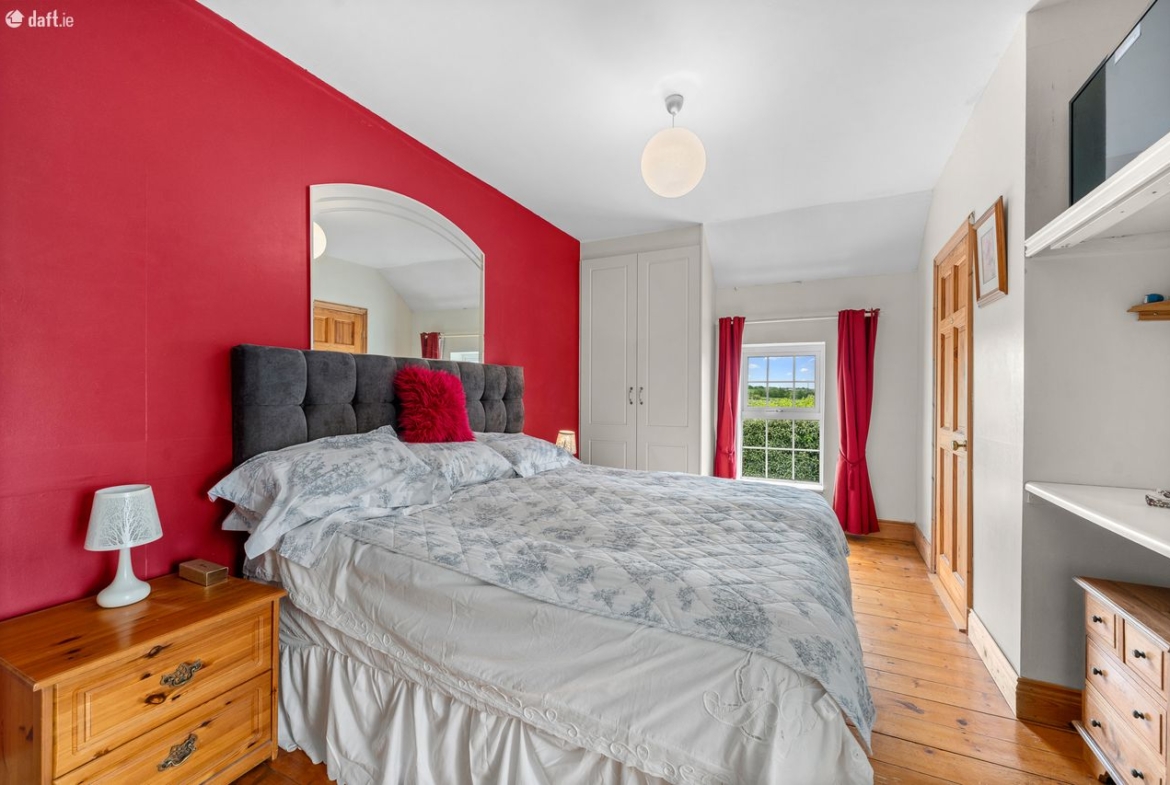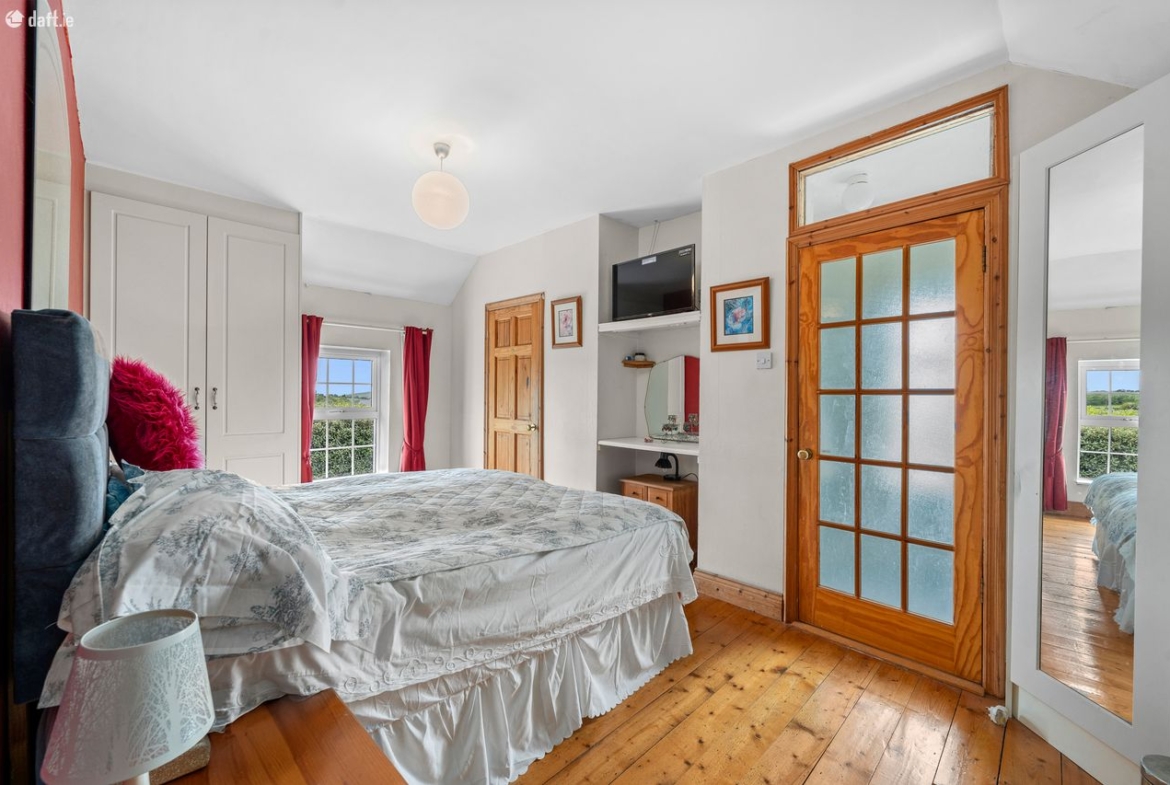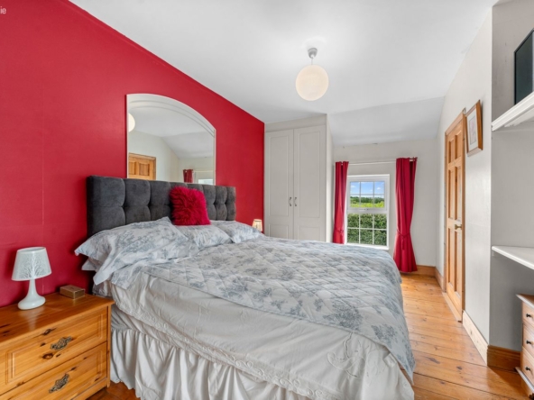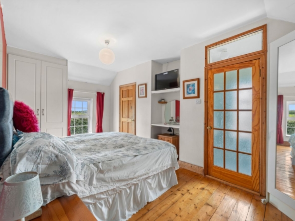 Master Bedroom: Front aspect double bedroom, with varnished pine flooring and built in storage press and vanity shelving.