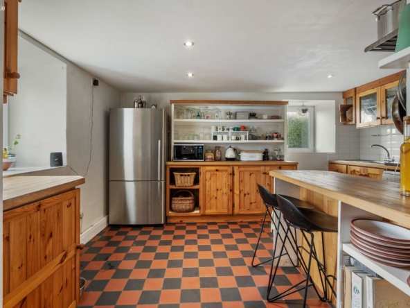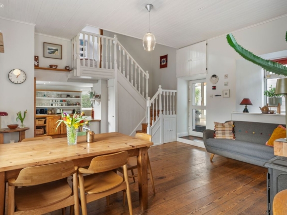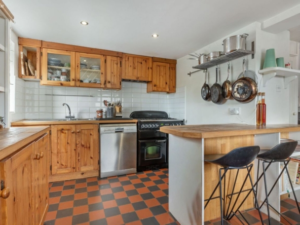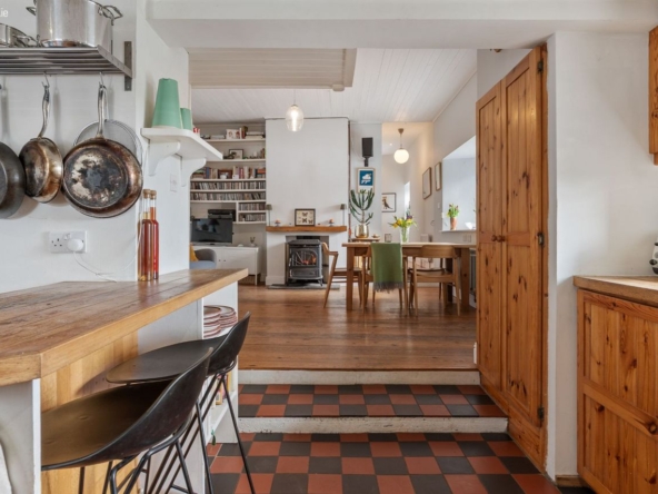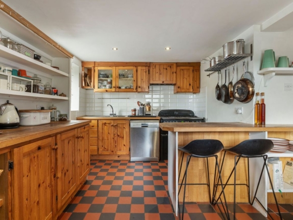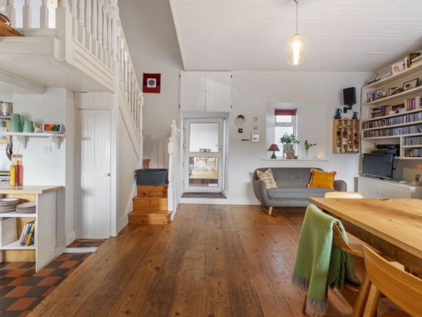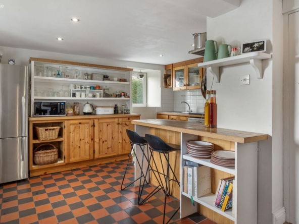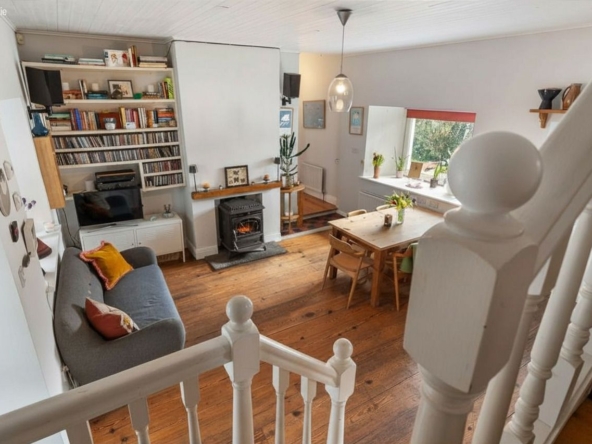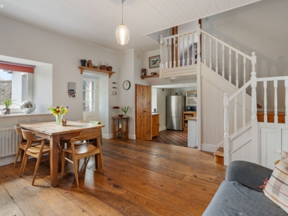 Area: A warm and central living space featuring wood flooring and a multi-fuel stove with back boiler heating all radiators. Stairs lead to mezzanine bedroom level. Step down to a traditional pine kitchen with Rangemaster cooker (gas hob with electric and gas ovens), free-standing fridge freezer and dishwasher.