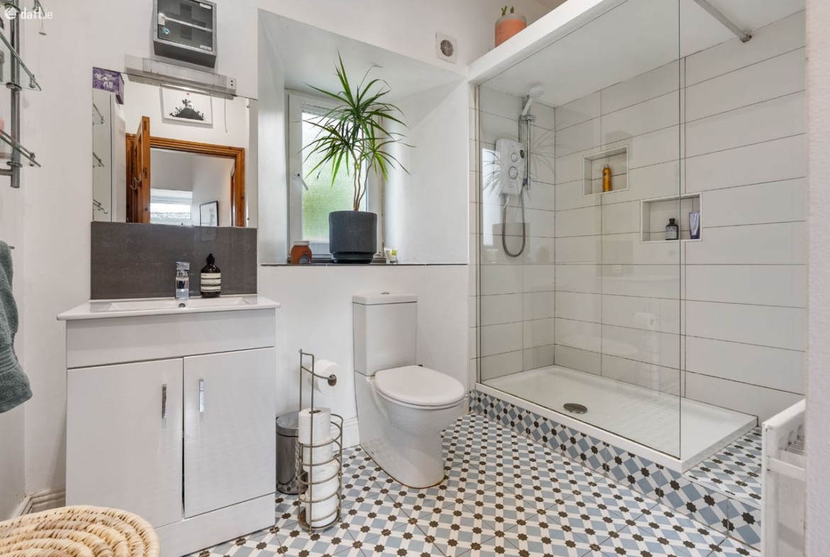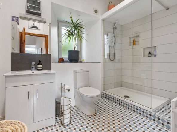 Bathroom: Tiled with large double electric shower, WC and wash hand basin.